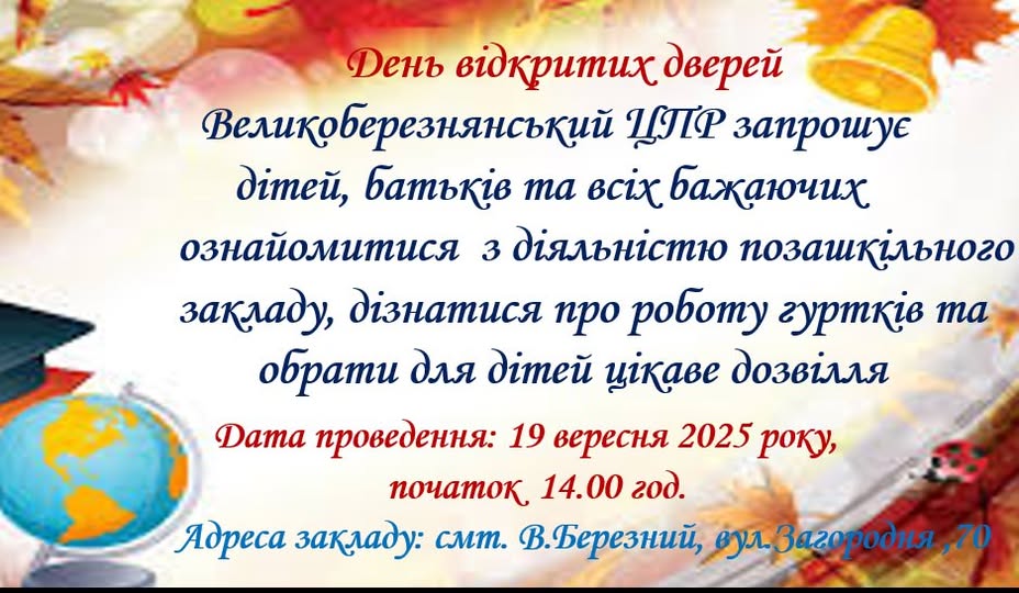 Свято День відкритих дверей у Великоберезнянському центрі позашкільної роботи з дітьми та юнацтвом проводиться щорічно на початку навчального року для ознайомлення дітей та їх батьків з роботою гуртків. Було створено умови для спілкування вихованців та керівників гуртків, проведено майстеркласи виготовлення різноманітних сувенірів